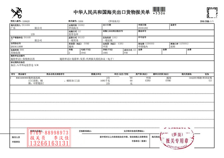 越南由于其特殊的地理位置優勢,貨物出口到越南的運輸方式比較多樣,可以選擇海運,空運,鐵路運輸,甚至可以發中越陸運.對于每一種運輸方式來講都有其優勢,而出口廠商在選擇物流時,可以跟據貨物概況,越南收貨的要求,以及自身的資質要求選擇便捷合規的貨運操作.下面聚海小編為大家主要講述一般貿易報關出口越南胡志明海運,而且是散貨拼箱模式,客戶有進出口權,需要一般貿易正式報關出口,并且要完成外匯核銷和出口退稅.此次案例的產品為:數控滾齒機,報關口岸為:筍崗海關.詳細操作流程和報關手續詳見以下內容: