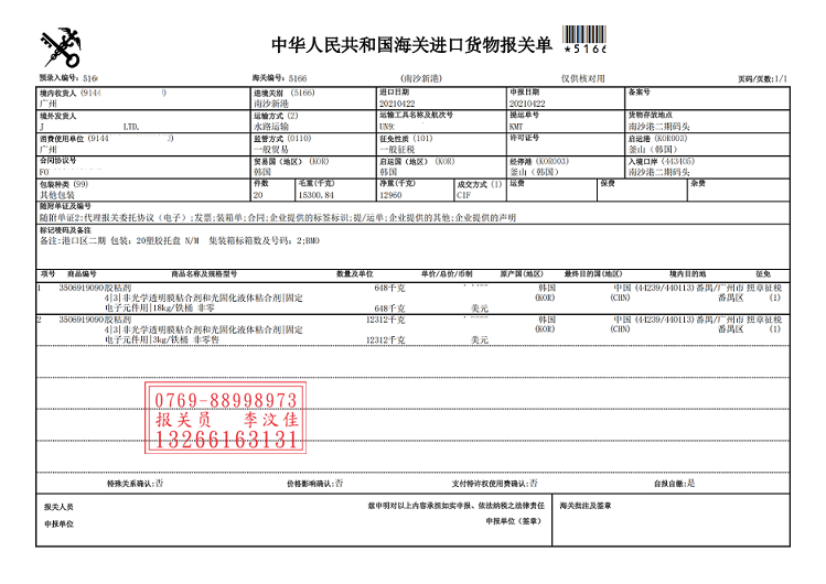 下面我們將重點放在此次韓國膠粘劑廣州南沙新港進口報關案例梳理環節.