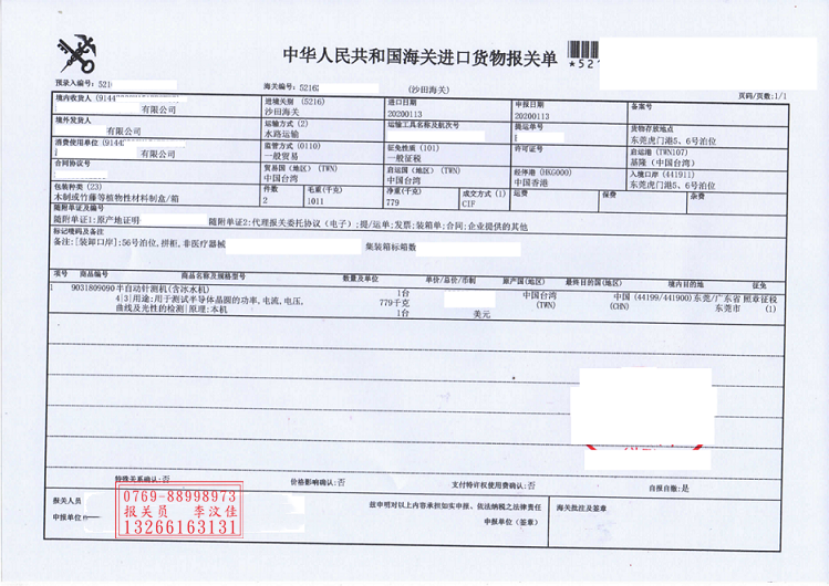 關(guān)于臺(tái)灣半自動(dòng)針測(cè)機(jī)東莞虎門港進(jìn)口清關(guān)案例就為大家分享到這兒,由于時(shí)間和能力有限,可能有些細(xì)節(jié)問題講述的比較含糊,請(qǐng)理解,當(dāng)然如果有論述錯(cuò)誤的地方,可以私信小編,以便能及時(shí)調(diào)整更改,謝謝~原創(chuàng)文章,謝絕抄襲!